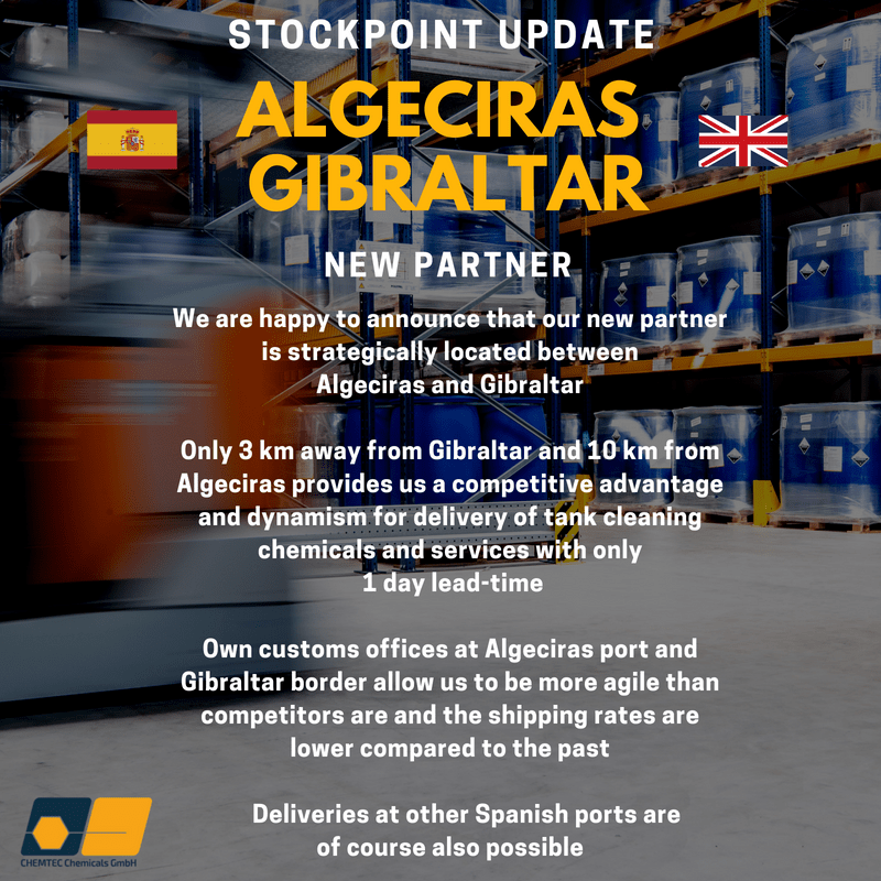 Only 3 km away from Gibraltar and 10 km from Algeciras provides us a competitive advantage and dynamism for delivery of tank cleaning chemicals and services with only 1 day lead-time